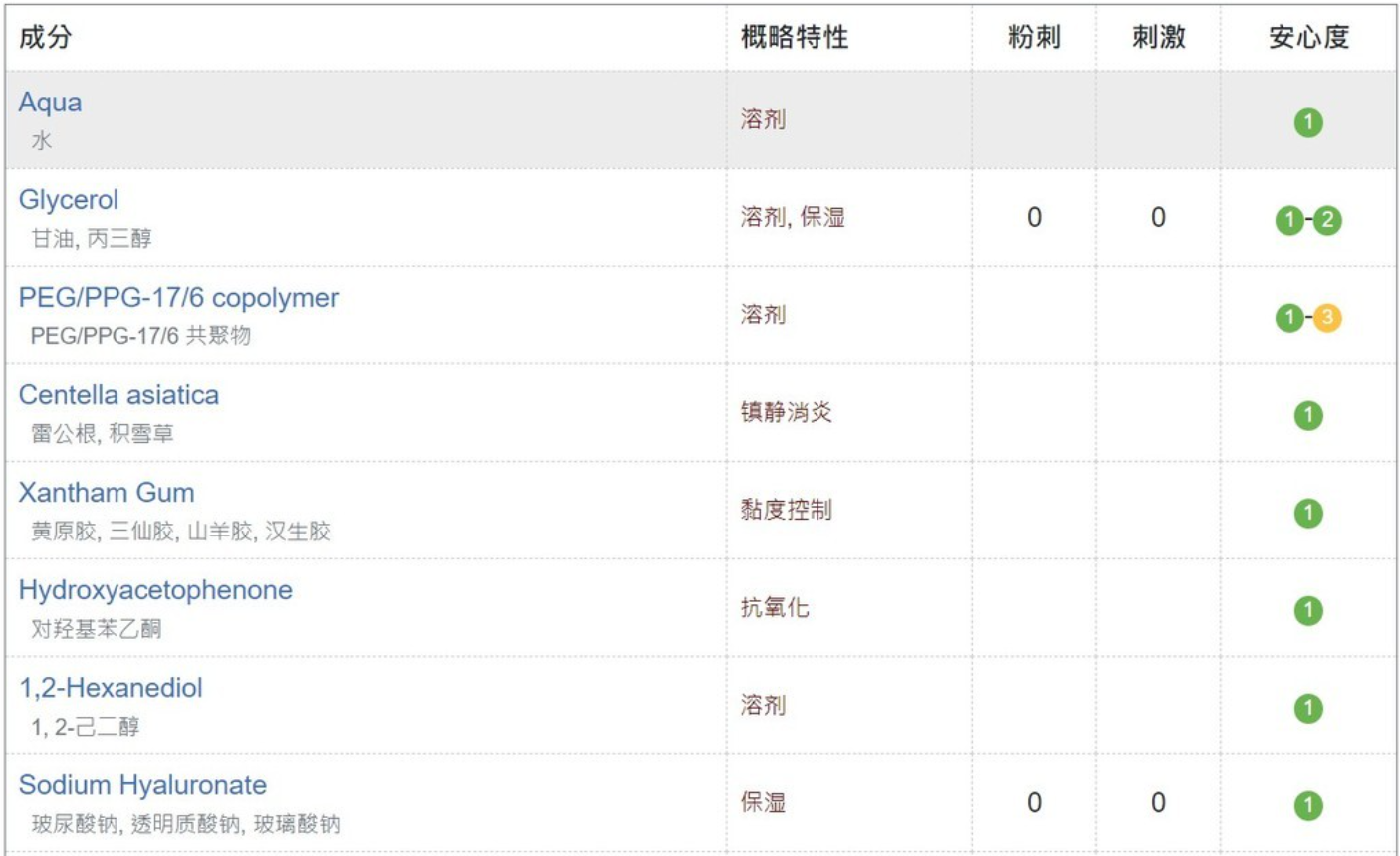 成分方面,基本全绿,没有香精色素防腐剂之类,主要还是水、甘油、PEG和积雪草提取物,具有较好的镇静消炎作用,用来修护皮肤损伤很管用。