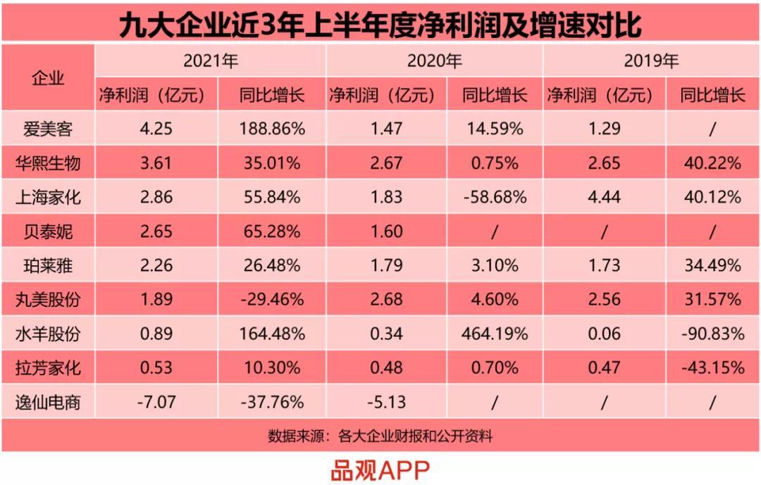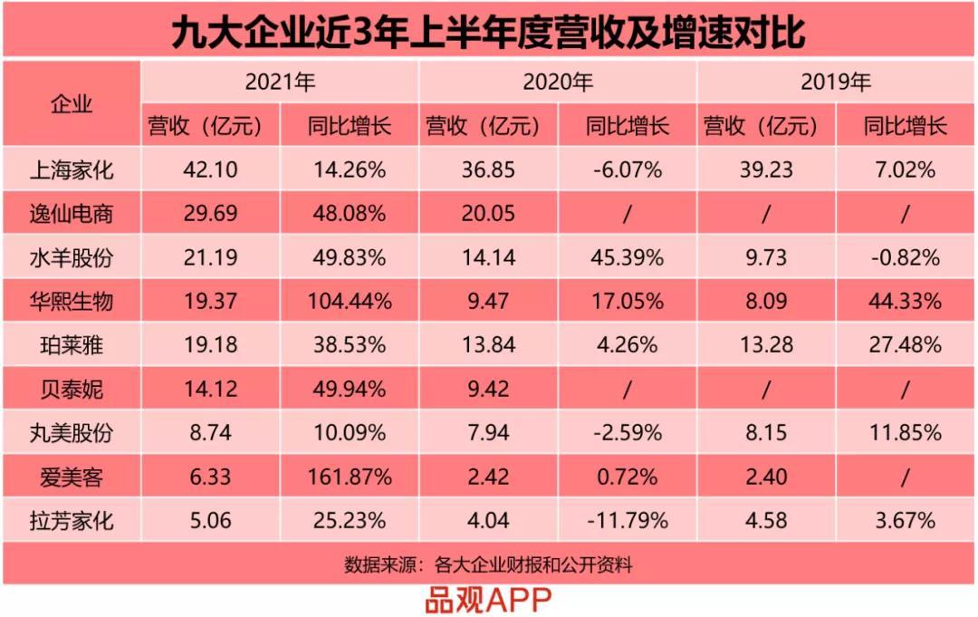 作为拥有120多年历史的美妆龙头企业,上海家化“宝刀未老”。财报显示,上海家化上半年营收42.1亿元,同比增长14.26%;净利润为2.86亿元,同比增长55.84%,两大主要指标的增幅均为近5年同期峰值。从总营收看,上海家化占9家公司总营收的四分之一。