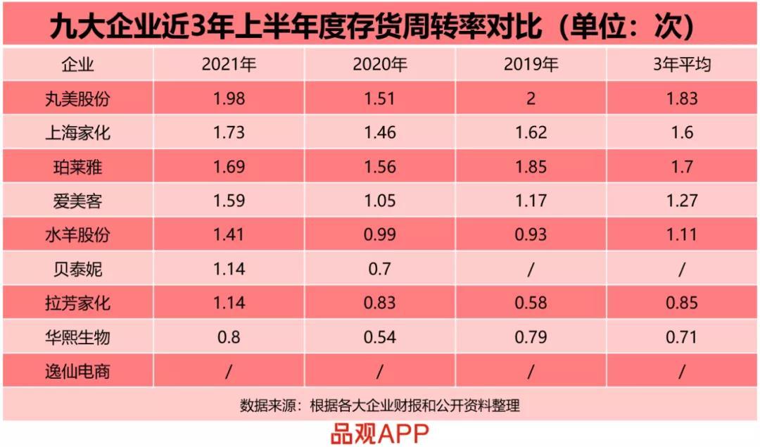 2021年上半年,丸美的存货周转率为1.98,在9家企业中位居第一。综合丸美近3年的数据看,其存货周转率也一直名列前茅,2019年这一数值甚至达到了2。
