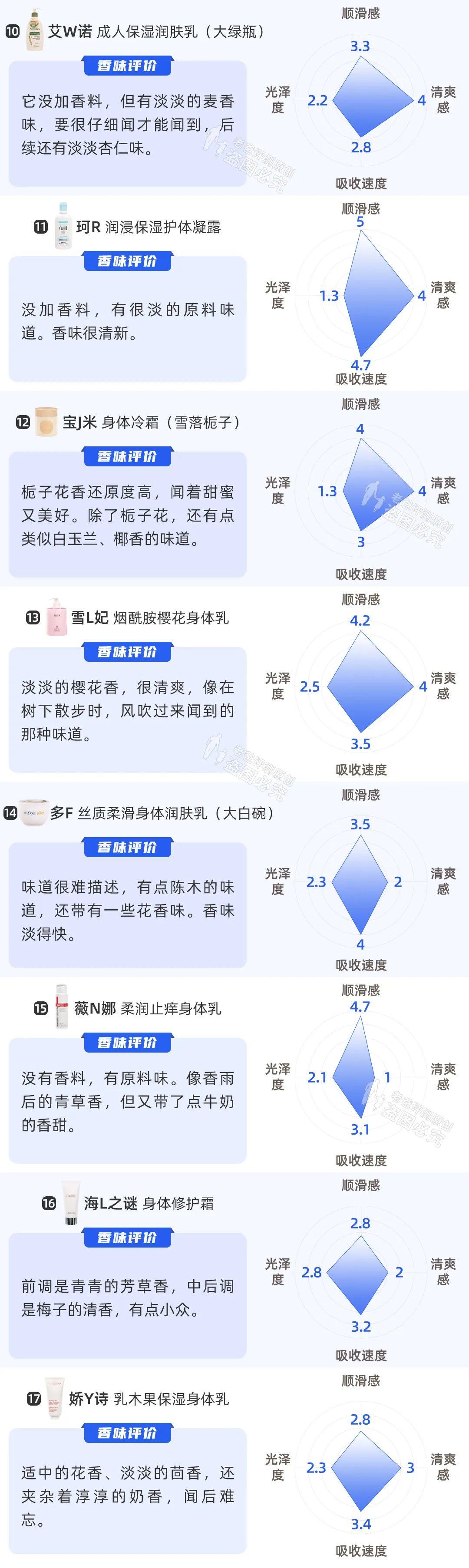 根据参与者打分,本期样品中 2 号妮W雅,7 号欧S丹、12 号宝J米从、13 号雪L妃的香味,大家喜欢程度更高!想看所有身体乳的主观喜欢程度的,后台回复【身体乳】查看。