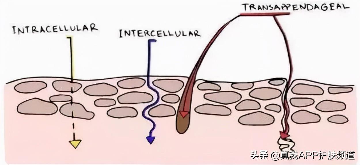 1) 从角质细胞的间隙渗透进入皮肤2) 通过角质细胞扩散进入皮肤3) 通过毛孔和汗腺孔进入皮肤(少量)