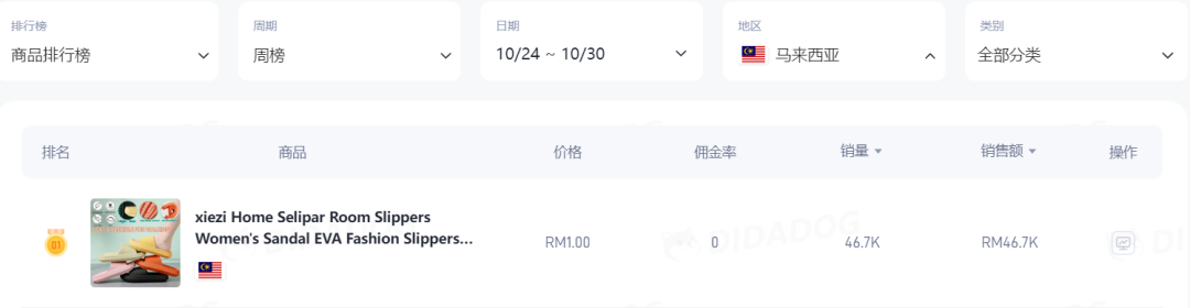 通过数据可以发现,这款拖鞋在过去一个月销量一直不太乐观,在10月25号销量飙升达到34.7K,达到一个高峰后,后期又立马跌落。