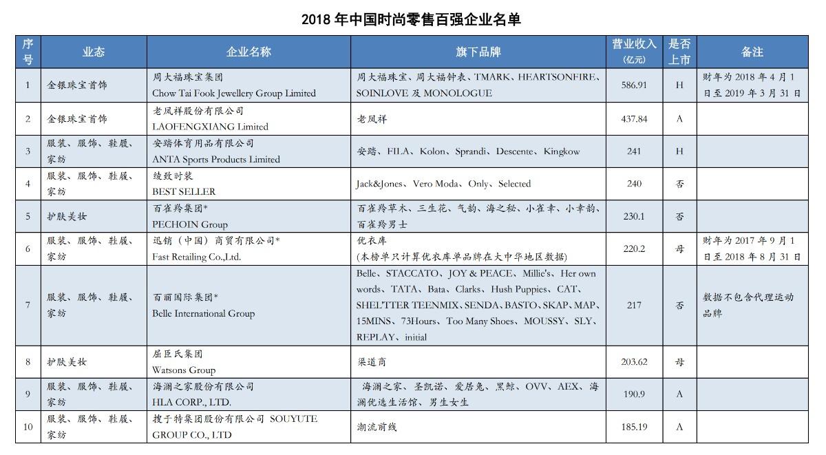 谁是中国时尚零售百强?由中国连锁经营协会年度行业调查统计的“2018年中国时尚零售百强企业”日前出炉,服装鞋履家纺等企业仍是大头,占比超7成。珠宝首饰类企业入选15家但“含金量”十足,周大福、老凤祥分列百强榜单前两位。