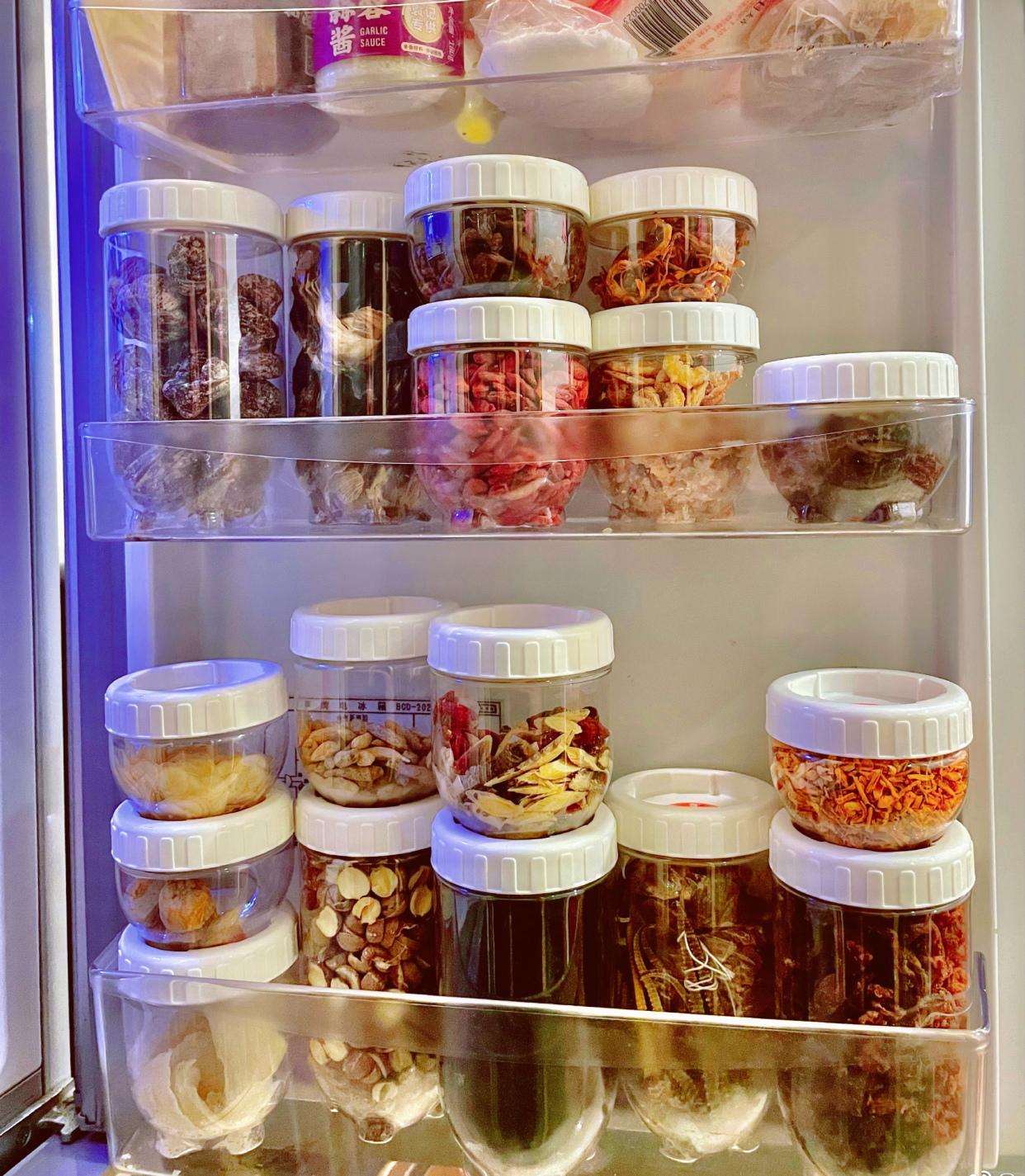 不要以为放这么多煲汤料很难用得完,广东阿妈煲汤是很讲求食疗作用的。上火了煲花旗参,咳嗽了海底椰、补气血用红枣花胶沙参七七八八,总之煲起汤来药材必须手到拿来,在用完之前必须补货!总之,冰箱有多大,煲汤料就有多少。