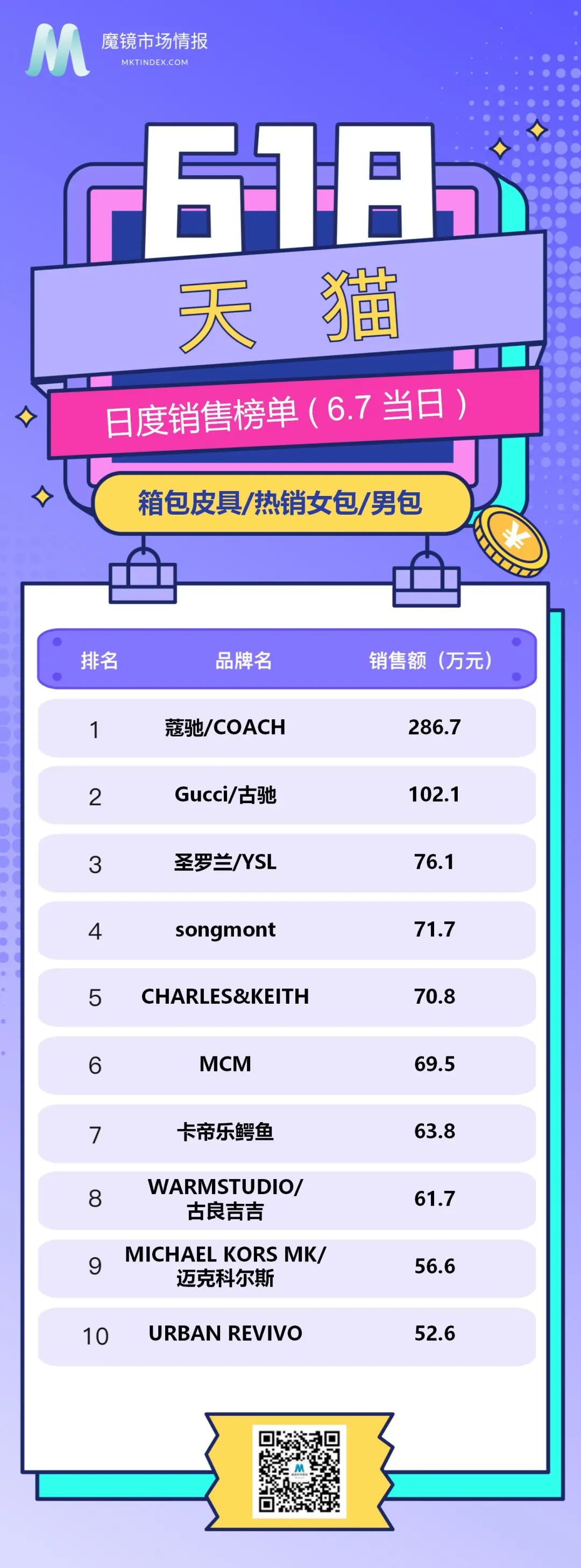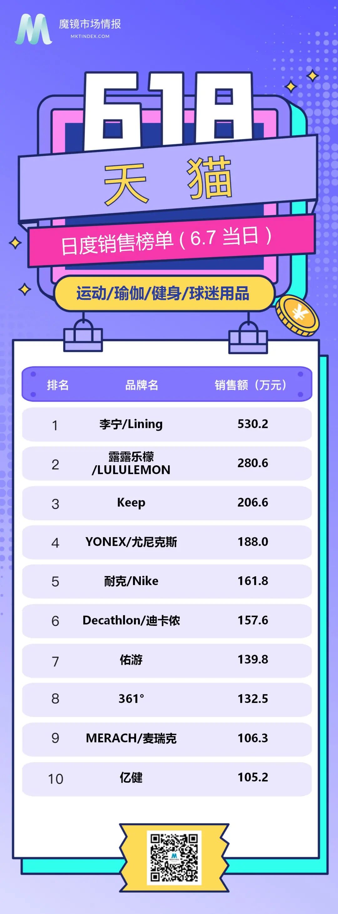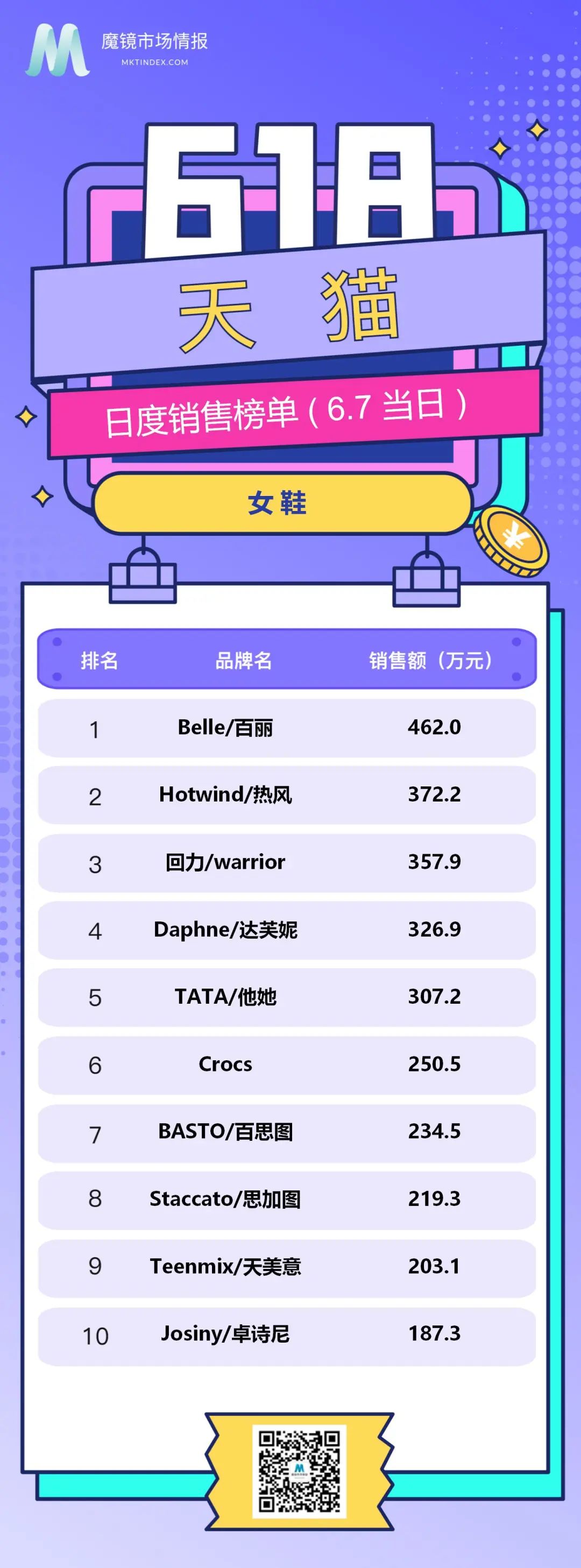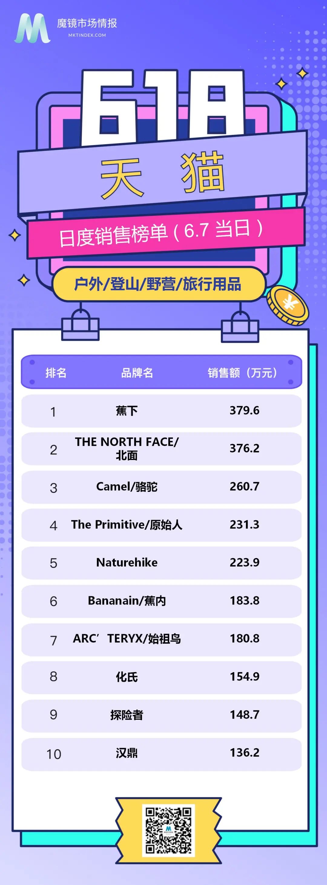 今天,魔镜市场情报为大家盘点一下运动户外、服饰鞋包行业中,天猫平台6月7日当天的销售额品牌排行。