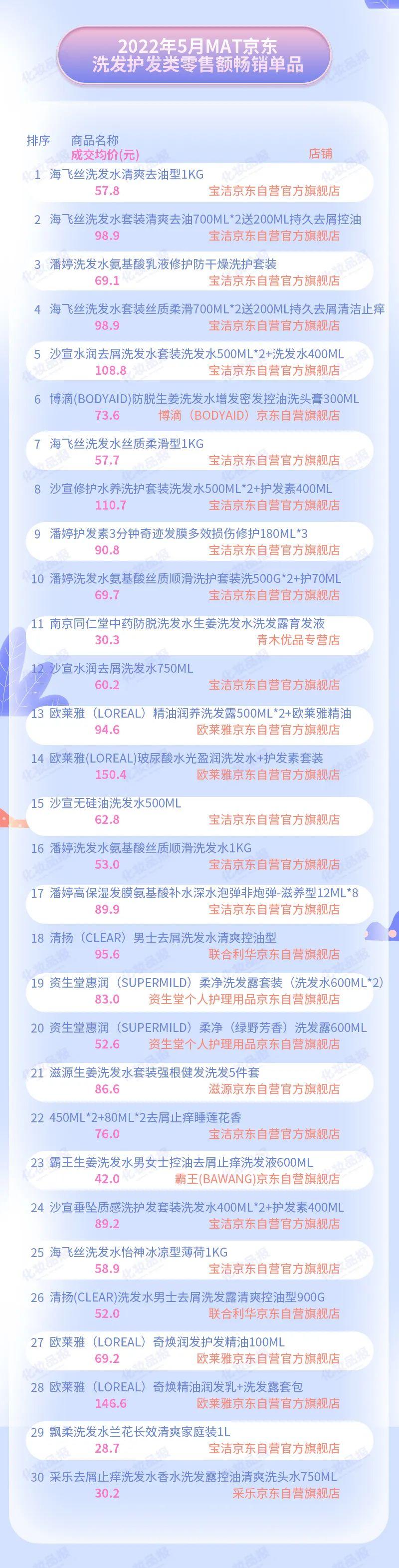 高端化/功能型成趋势随着消费者护发美发意识提升,在选择头皮护理产品时,人们不再满足于基础的洗护功,而是追求强功、强功能的洗护产品。2021年6月-2022年5月,天猫、京东洗发护发类畅销单品在产品功上多以去屑止痒、柔顺护发、防脱、留香等为高频宣称。综合来看天猫、京东60个畅销单品,去屑止痒类单品占比超过26%,针对干枯毛躁等痛点的护发类单品占比50%。此外,香氛类、防脱类、大容量或套装类洗护发单品仍广受消费者青睐。其中,“海飞丝洗发水”同时位列天猫、京东畅销榜第一。