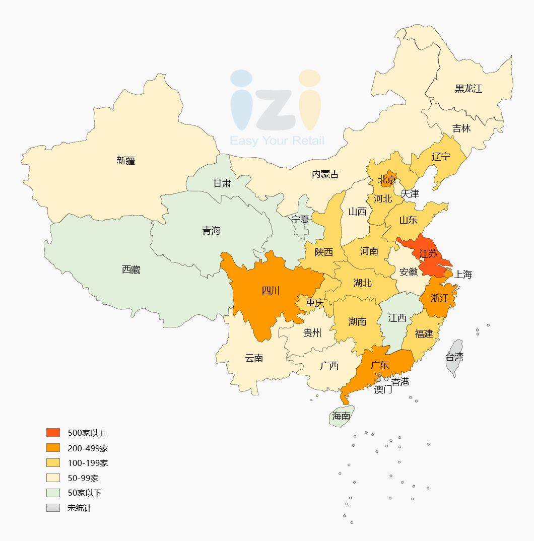 江苏省以约510家店成为高端化妆品店铺多的一个省份,上海、浙江、北京、广东、四川紧随其后,再后面是陕西、山东、辽宁、重庆。