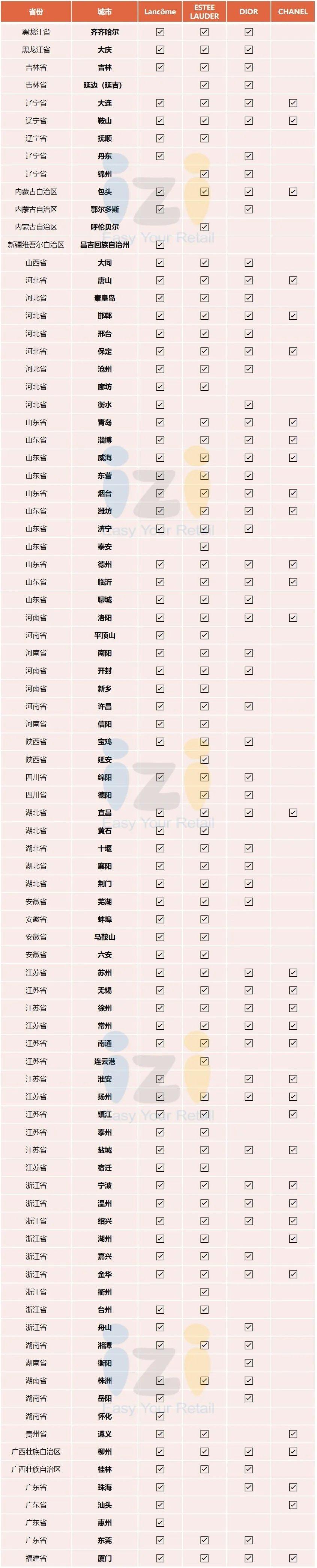 从单品牌来看,Lancôme、Estee Lauder、Shiseido、Dior的拓展范围广,进驻的城市已经接近或者超过100个。