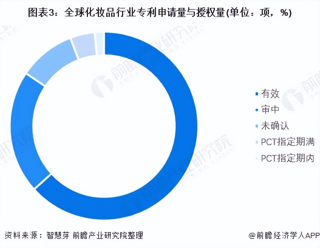 目前,化妆品行业共有329146项专利处于“有”状态,占全部专利数量的63.3%;处于“审中”状态的有109999项,占比21.16%。