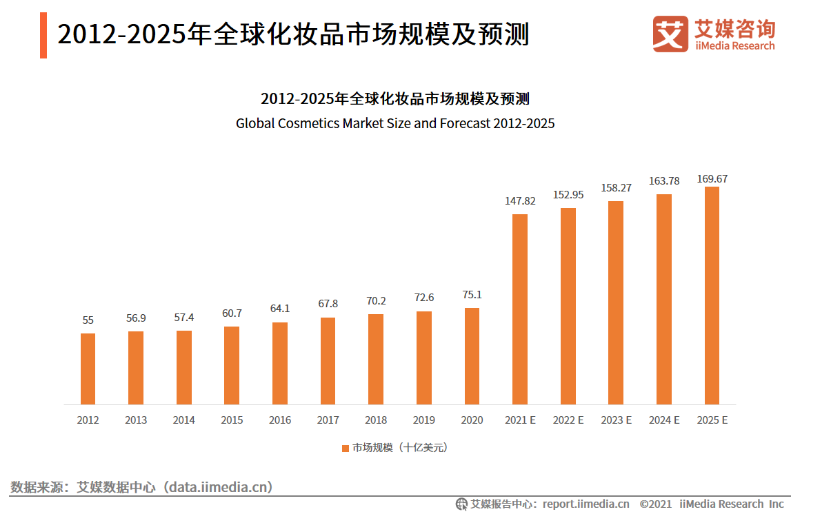 iiMedia Research(艾媒咨询)数据显示,2020年化妆品市场规模已达到751亿美元,预计到2025年,化妆品市场规模将达到1696.7亿美元。