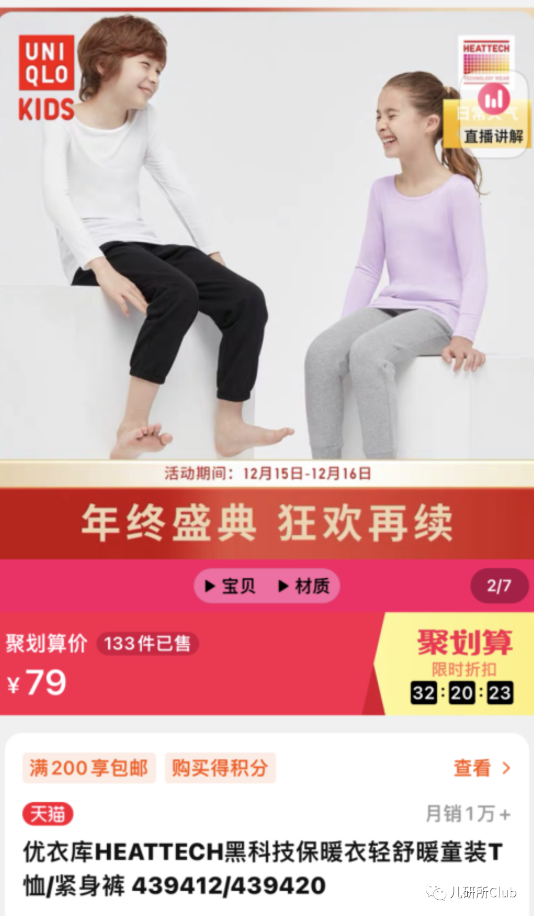优衣库也将这项黑科技延伸到了它的童装系列中,一款HEATTECH黑科技保暖衣童装在淘宝旗舰店中月销量可达1万+。