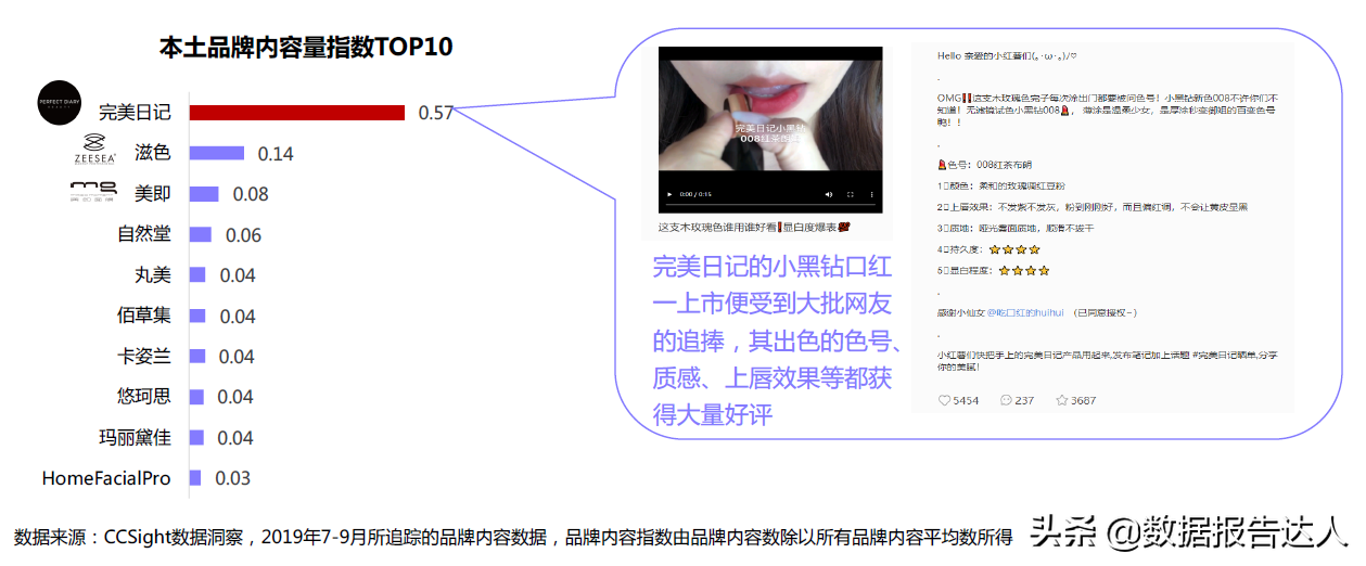 >日记的内容量指数为0.57,成为内容提及多的本土美妆品牌,滋色、美即分别位于第二第三的位置;