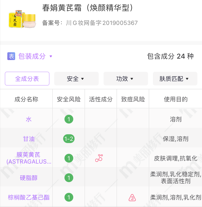 春娟黄芪霜当中,主要成分就是黄芪,入护肤品后能够帮助皮肤抗氧化,起到补充气的作用,让皮肤由内而外“亮”起来。