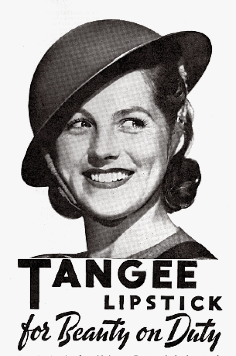从20世纪20年代至40年代,化妆品丹祺(Tangee)以其口红闻名。在第二次世界大战期间,公司针对爱国女性发布了一系列平面广告,包括这一张。