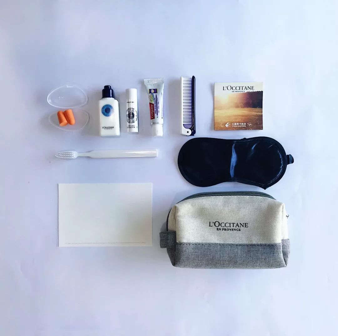 首先从比较基本配备的开始。东航公务舱的洗漱包用的是一款棉麻质地、针织手感的欧舒丹,里面有唇膏、润肤露,并且配有梳子、眼罩、耳塞和牙膏牙刷。如果和经济舱比,当然挺实用的,但这个只讲求功能的洗漱包中却少了点小巧思,内容和国航的惊人类似,能加上一些类似保湿喷雾的personal touch会更好。