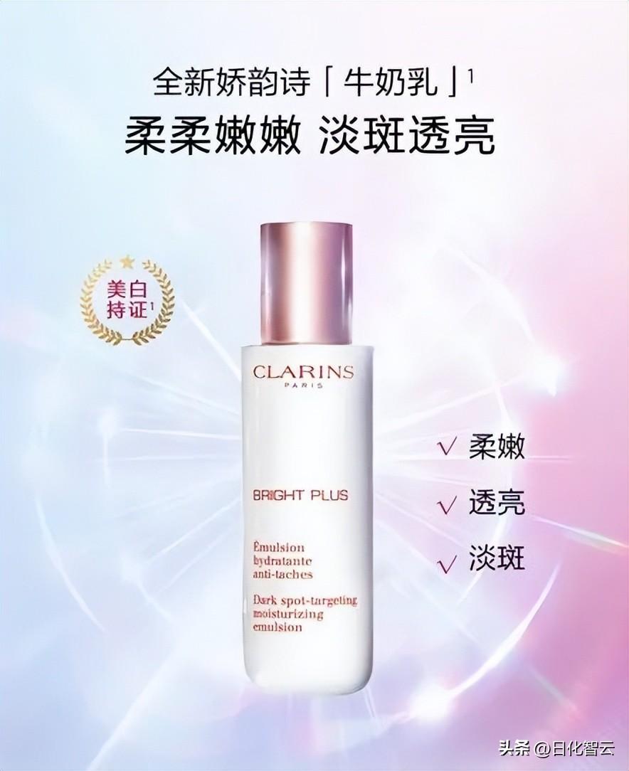 娇韵诗全新牛奶乳液主打美白保湿,加入VC和天山羽衣草、杏仁油、海百合等复合植萃成分,美白保湿一瓶兼顾。