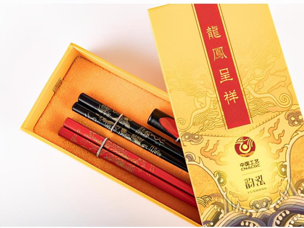 龙凤呈祥自古都是婚庆美满的吉祥语,此款筷子包装采用故宫大婚喜服图案,产品结合了传统工艺,是结婚送新人的伴手礼。