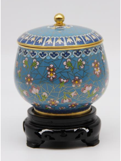 作品以梅花纹和冰裂纹巧妙结合,梅花有吐芳于岁末,凌雪展枝盛开的高洁品质,冰裂纹自然天成、错落有致、是高雅文化的集中体现,用景泰蓝技艺的表现形式呈现出新的审美形式,体现出人们对大自然的崇尚,彰显美好时代风尚。