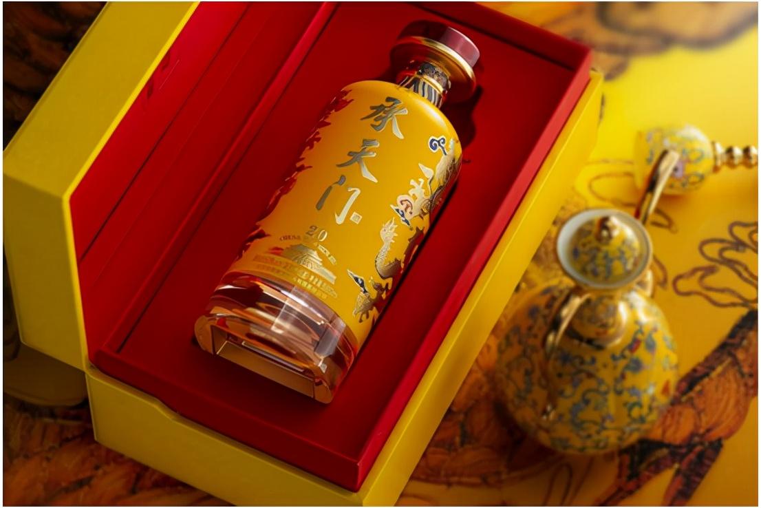 烫金浮雕承天门图腾,彰显气度。瓶盖采用仿南红玛瑙材质打造,有如朝冠。瓶颈纹样源自“海水江崖纹”,寓意福山寿海。