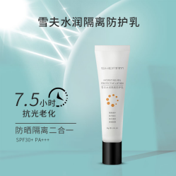 雪夫水润隔离防护乳,有成分二氧化钛,隔离和反射UVA/UVB,高能防护肌肤免受光辐射。微分子渗透,富含多重活性精粹成分(水解透明质酸钠、红没药醇、角鲨烷、生育酚)修护受损细胞、舒缓止红、强韧屏障、抗氧化又提亮肤色。