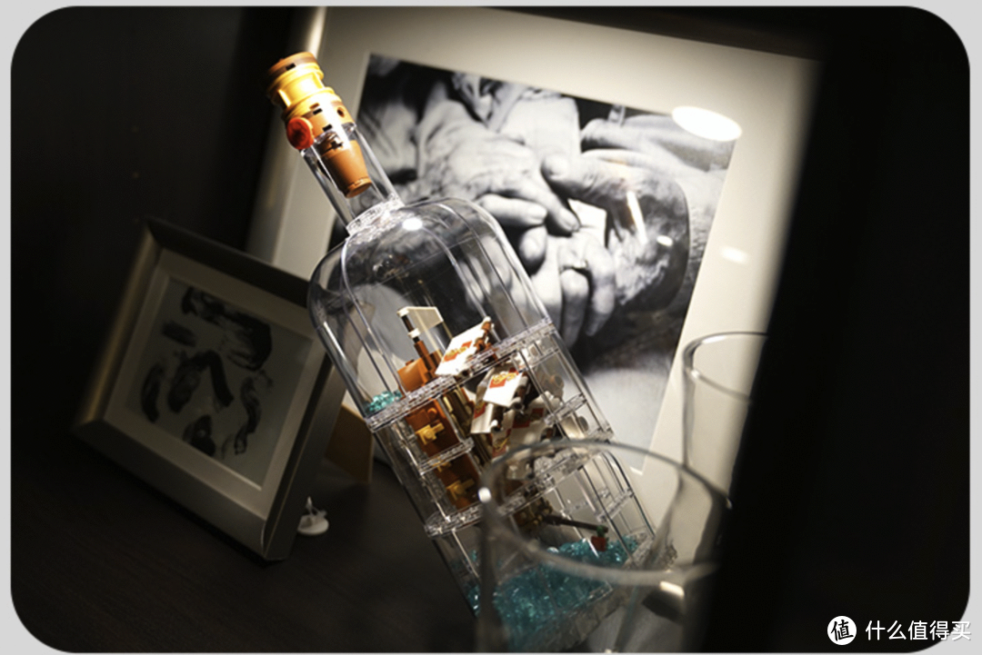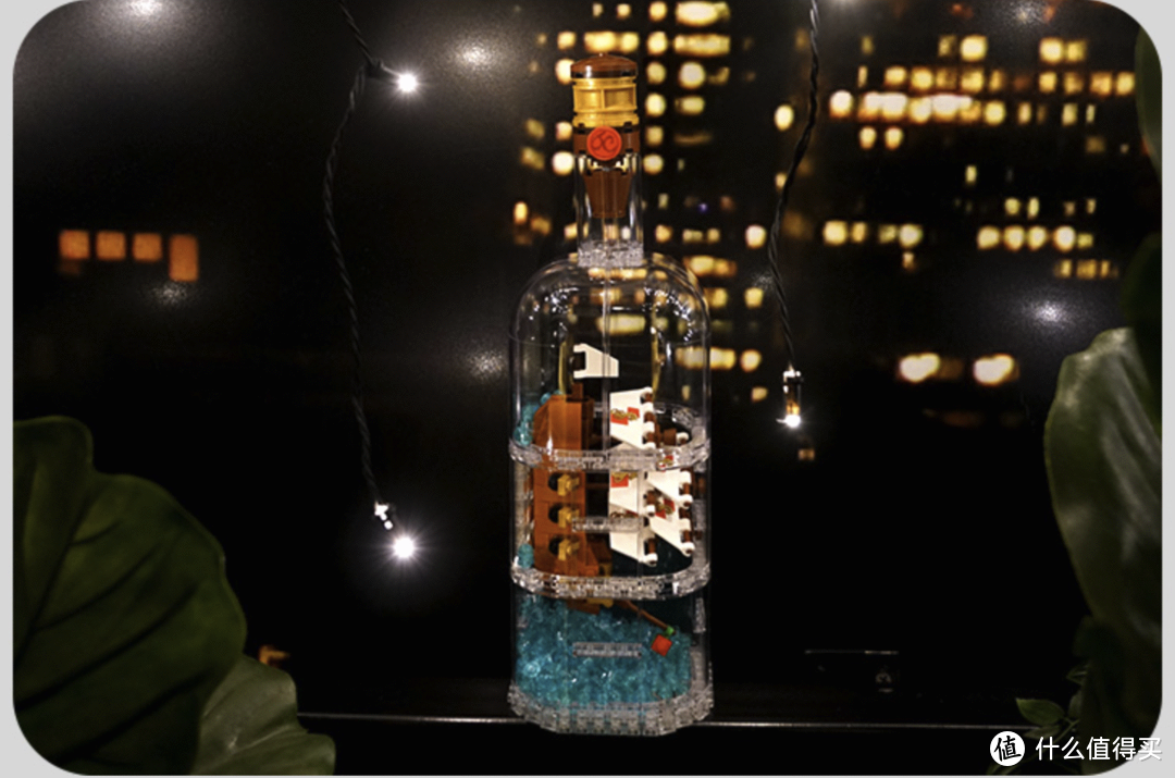 乐高瓶中船,是近年来热度很高的一个ideas单品。它有962个颗粒,其中很多都是分布在瓶子中的水颗粒。套装主体是一个瓶子,瓶子中蓝汪汪的水面之上,漂浮的是一艘小巧、精致的小船。瓶子下面的底座也很细致,底座是古典的棕色,中心是一个指南针,左右有两个小小的地球仪。