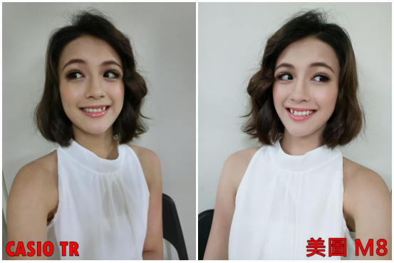 从这组照片可以看得出来,卡西欧TR虽然保持了原本的肤色,但脸部却因为阴影的关系显得偏暗;而美图M8针对脸部进行了自动补光,但肤色似乎偏白了些,有点失真。