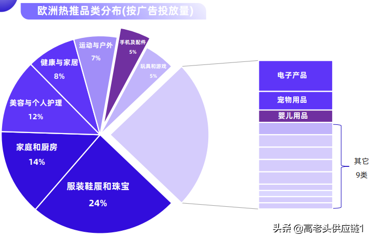 欧洲是第三大电商市场,到2022年欧洲电商市场规模将达到2450亿欧元。独立站热推品类数据中,户外运动和手机配件品类分别占比7%和5%,相较其它地区市场更突出。