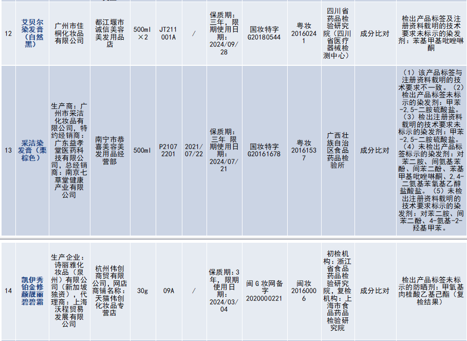 23批次不符合规定化妆品分别为: