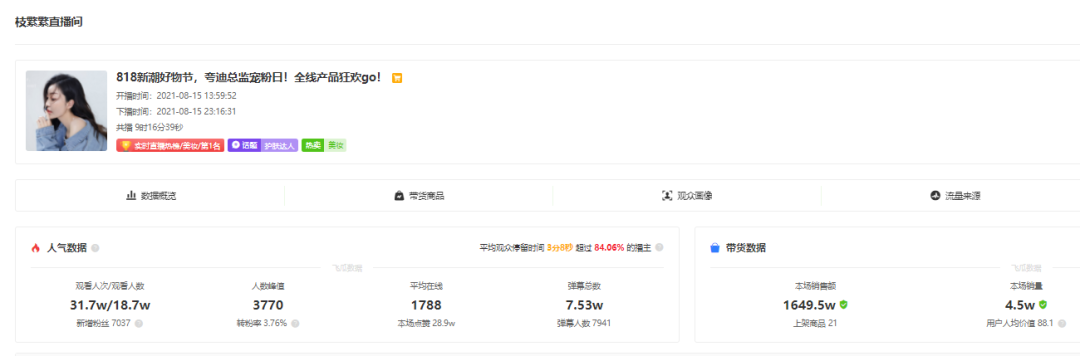 在8月15号当晚,一位叫 @枝繁繁 的仅4.7w粉丝的抖音账号,却在9小时的直播中为华熙生物集团旗下的品牌夸迪带来了1649.5W的销售额。