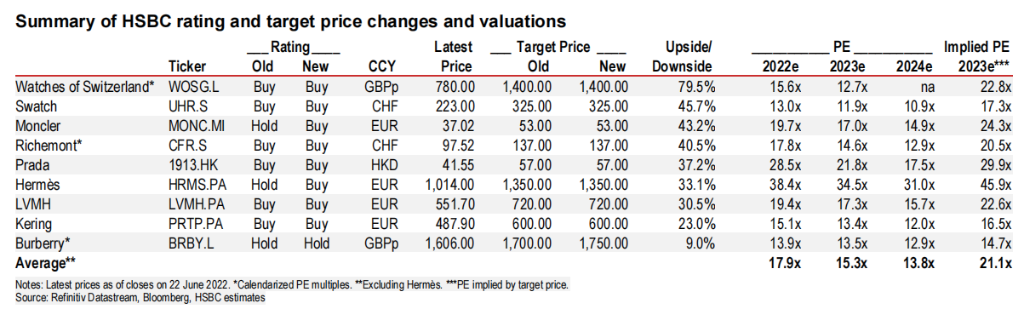 与Gucci市场份额下降并需要重新投资的开云集团,以及再投资于销售广告的历峰集团不同,汇丰认为没有多少因素能阻止LVMH在每个部门都保持利润率,除了干邑品牌轩尼诗,尽管在2Q22补充了库存,但1H22的销售额可能下降,以及去年同期利润率略显异常的香水和化妆品部门。