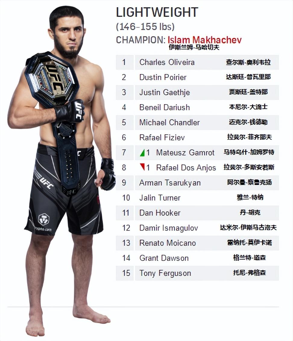 由于上周末结束的UFC 282主赛,现排名第3的安卡拉耶夫和现排名第4的布拉乔维奇分歧判定战平,导致轻量级头衔仍然空缺。