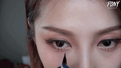 细细的填补内眼线,并且将眼线延长到眼尾外,成一个小尾巴。