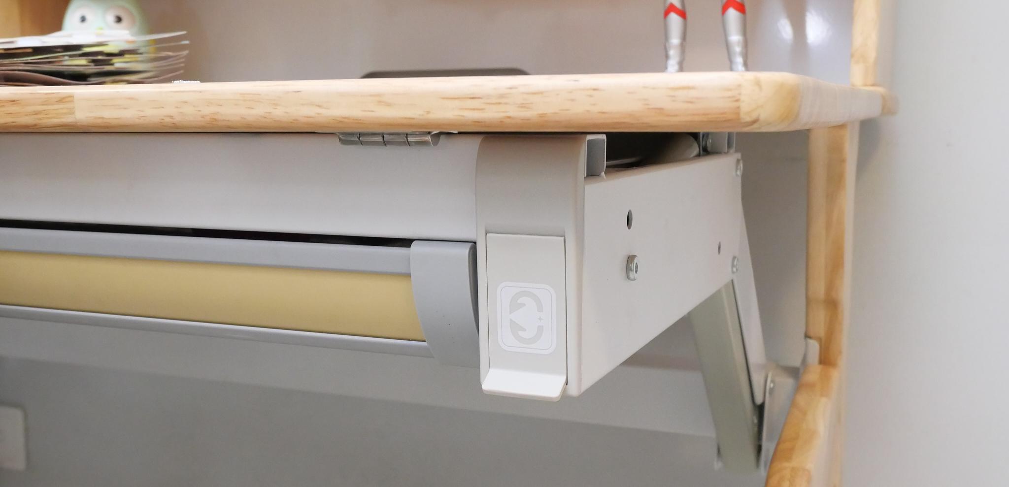 桌面也是可以进行角度调节,通过右手边的按钮完成角度调节。做大调节角度为45°满足于不同的使用需求,水平面可以作为日常学习、写作业使用,倾斜面可以作为阅读和绘画使用。对于日常使用来说角度调节有助于帮助儿童养成正确的学习姿势,同时也能避免近视眼的发生。