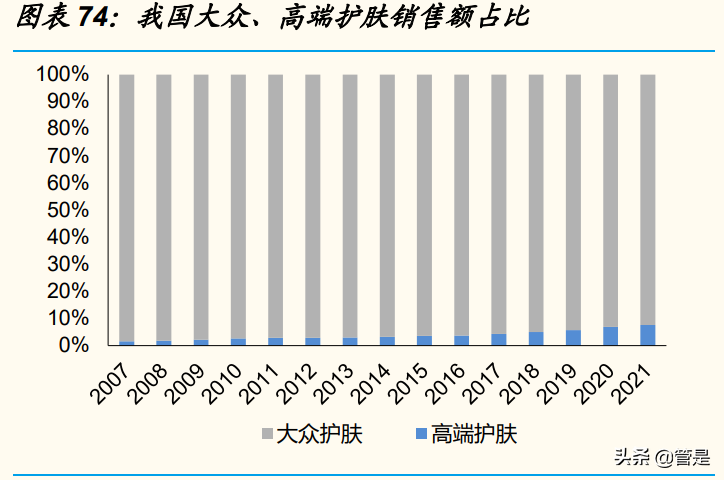 根据欧睿数据,近十余年我国高端护肤市场增速持续高于大众、占比提升, 特别是 17 年来分化加剧。2016-2021 年高端护肤市场零售额复合增速 30.2%、 占护肤的比由 3.7%提升至 7.6%,21 年零售额规模 235 亿元,同期大众护肤 CAGR5 为 11.8%。