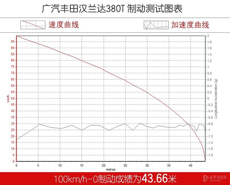制动测试制动距离是车辆的另一基础性能,汉兰达380T配备了前后通风盘的制动系统,轮胎则是偏性能取向的邓禄普SP SPORT MAXX 050系列,尺寸为235/55 R20,在制动上应该会有不错的表现。不过由于我们测试当天持续飘雨,地面并非完全处于干燥状态,影响了制动测试成绩。