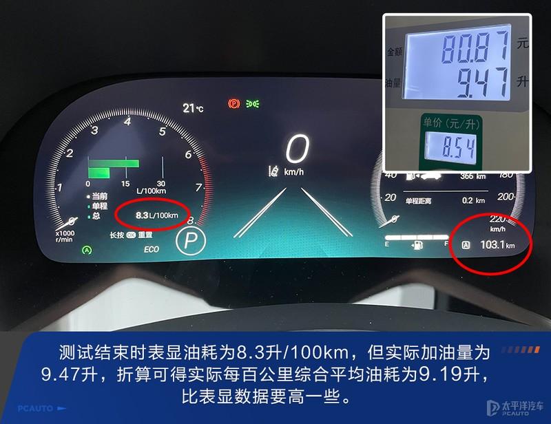 油耗测试去年我们已经测试过了双擎四驱版百公里综合油耗为6.43L/100km,这个表现对于一台重达2.1吨的SUV真的太香了。那么采用2.0T纯燃油动力的380T版本,油耗会不会比混动版高很多,以至于劝退消费者呢?