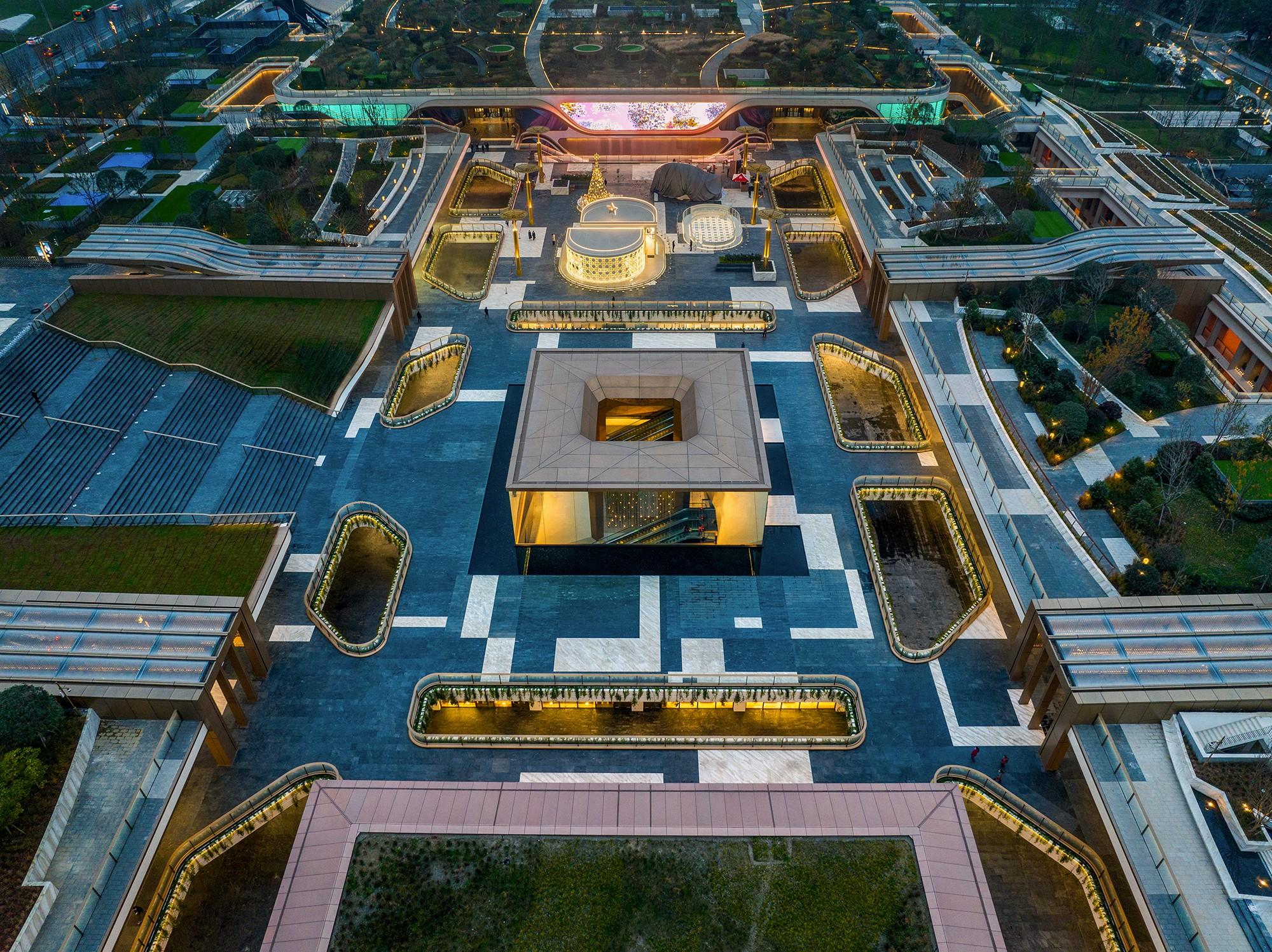 成都SKP-S上方,伫立着六根景观水柱。相较于传统由下往上喷水的喷泉,景观水柱的水是由上至下流淌,意指天府之国的天上来水。当夜幕降临,景观水柱将呈现七彩渐变、闪动跳跃、环状灯带、同色灯光等4种灯光变换形式,每4分钟一个循环变换。