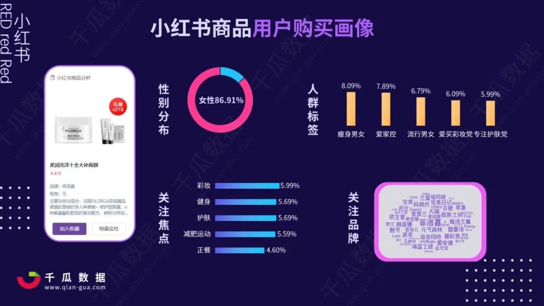 根据千瓜数据小红书商品用户购买画像,关注的焦点集中在彩妆、健身、护肤、减肥运动、正餐五个领域。运动和美妆结合,创造具有运动功能性的美妆产品,也正在形成全新的跨品类营销竞技场。