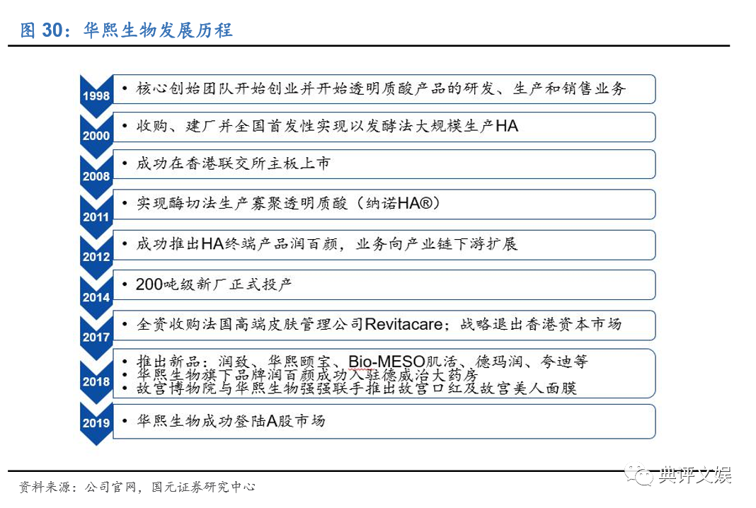 2.3华熙生物:凭借原料技术优势,快速攻占功能性护肤品赛道透明质酸原料起家,功能性护肤品“底气十足”。公司成立于1998年,以透明质酸原料起家,致力于功能性研究,遵循制药的高标准研发生产,继2012年公司的注射用修饰透明质酸凝胶获批上市后,公司成功的塑造了在市场上有影响力的“润百颜”品牌,并将“润百颜”的系列产品扩充到原液、面膜等护肤品类,自此开始涉足功能性护肤品领域,并逐步确定了“多品牌多渠道”的战略。2018年底,有“中国化妆品研发第一人”之称的李慧良先生加入公司,成为化妆品线研发核心人物。公司深入研究不同分子量透明质酸、γ-氨基丁酸、依克多因等生物活性物质及其交联衍生物对人体皮肤的功,并以此为核心成分,开发了一系列针对敏感皮肤、皮肤屏障受损、面部红血丝等皮肤问题的功能性护肤品,并在研发、生产和品种管理等多个环节按照制药的高标准进行,功性和性。