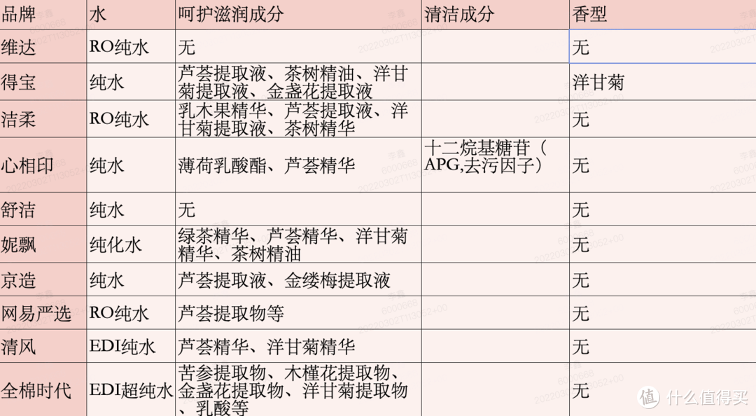 这一测试主要是考虑到值友使用湿厕纸的时候,对滋润肌肤等成分的偏好。数据都取自商品实物外包装。