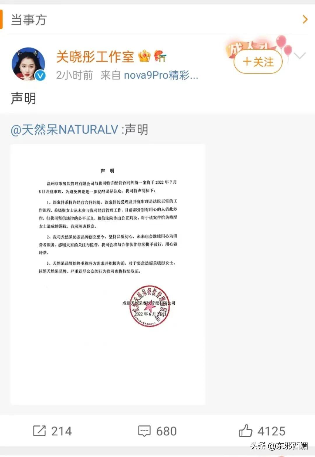 天然呆奶茶声明中称,“关晓彤女士从未参与经营管理工作”,为“该案件给关晓彤女士造成的困扰深表歉意”。