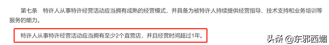 根据《商业特许经营管理条例》,加盟店需满足“两个直营店且经营时间超过一年”的低要求。