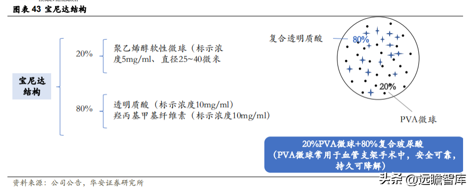 宝尼达含有 20%的聚乙烯醇软性微球+80%的羟丙基甲基纤维素透明质酸。PVA 微球能够刺激胶原再生,并且常用于血管支架手术中,可靠并持久可降解。宝尼达上市后定位高端,作用周期长达 8-10 年,在长玻尿酸中受到认可。