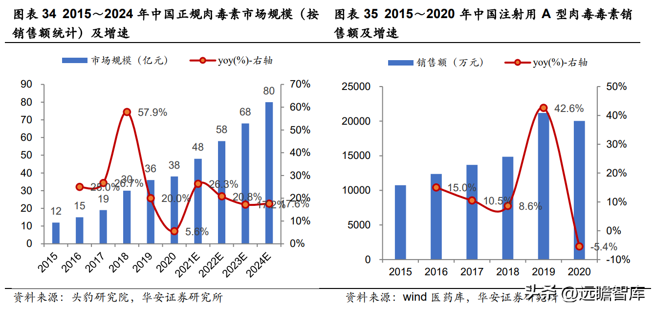 从销售额来看,2019 年中国注射用 A 型肉毒毒素销售额达到 2 亿元。2020 年中国合规医疗机构市场规模达 38 亿元,2015~2020 年 CAGR 高达 25.9%。