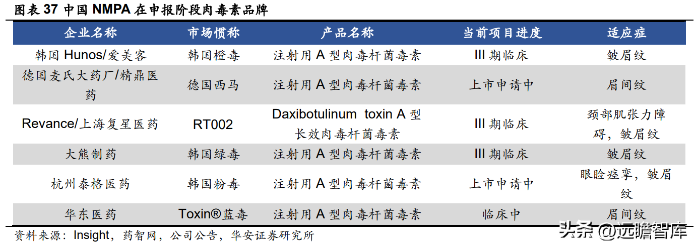 2020 年下半年由法国益普生公司生产的和由韩国 Hugel 公司生产的相继获批上市,至此中国获批品类增至四个,获批产品在规格、弥散性以及包装形式上各异、涵盖更多的价位段,中国正规产品得到进一步丰富。此外有多款新产品及新适应症在临 床试验中。其中,精鼎医药和泰格医药已完成 III 期临床试验,正在进行上市申请。