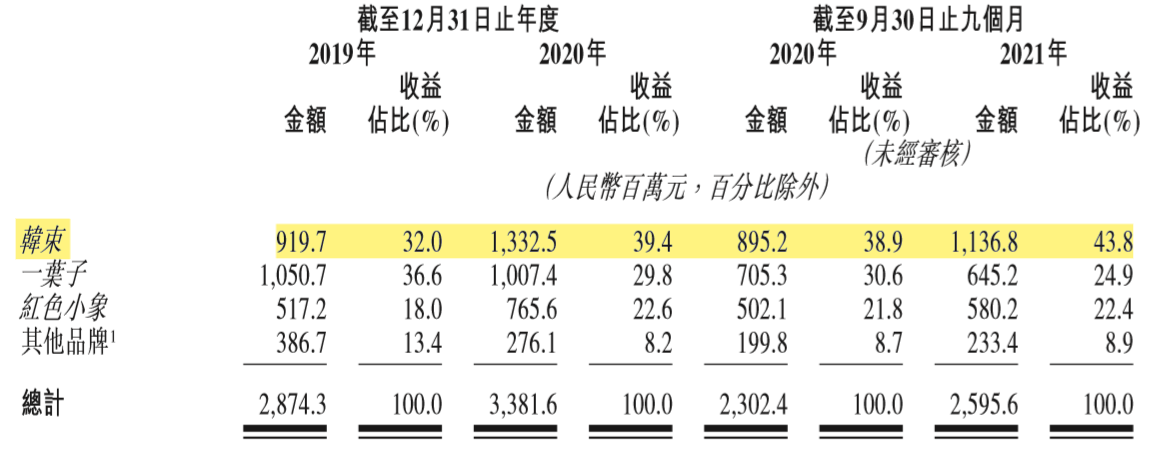 2019-2020年,及2021年前九个月,韩束产生的收益分别占上美集团总收益的32.0%、39.4%及43.8%。