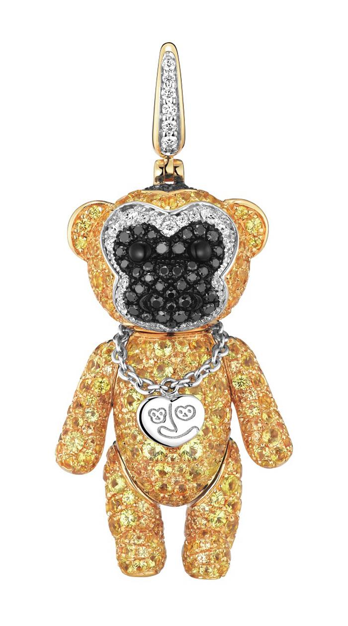 它通体由18k黄金铸造,并镶嵌有华贵的钻石、黑钻石和黄色蓝宝石,浑身散发出耀眼夺目的熠熠光辉。其头顶有一小撮海南长臂猿独有的黑毛,胸口惹眼的项链暗藏本次消博会的logo造型——两只环臂相拥的海南长臂猿其乐融融,带来独具一格的当代珠宝新风貌。