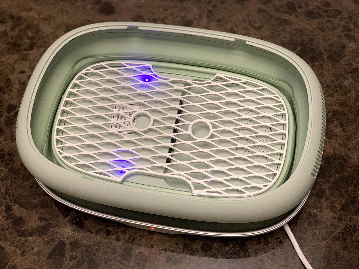 moido是普通的巴氏高温+UV杀菌方式,底部设计有两个uv紫外线灯,同样可分开操作,单独烘干和单独除菌。中间黑色斜槽处是出风口,暖风顺着斜槽往上,充满整个干衣盒,在两边的出风口排出。