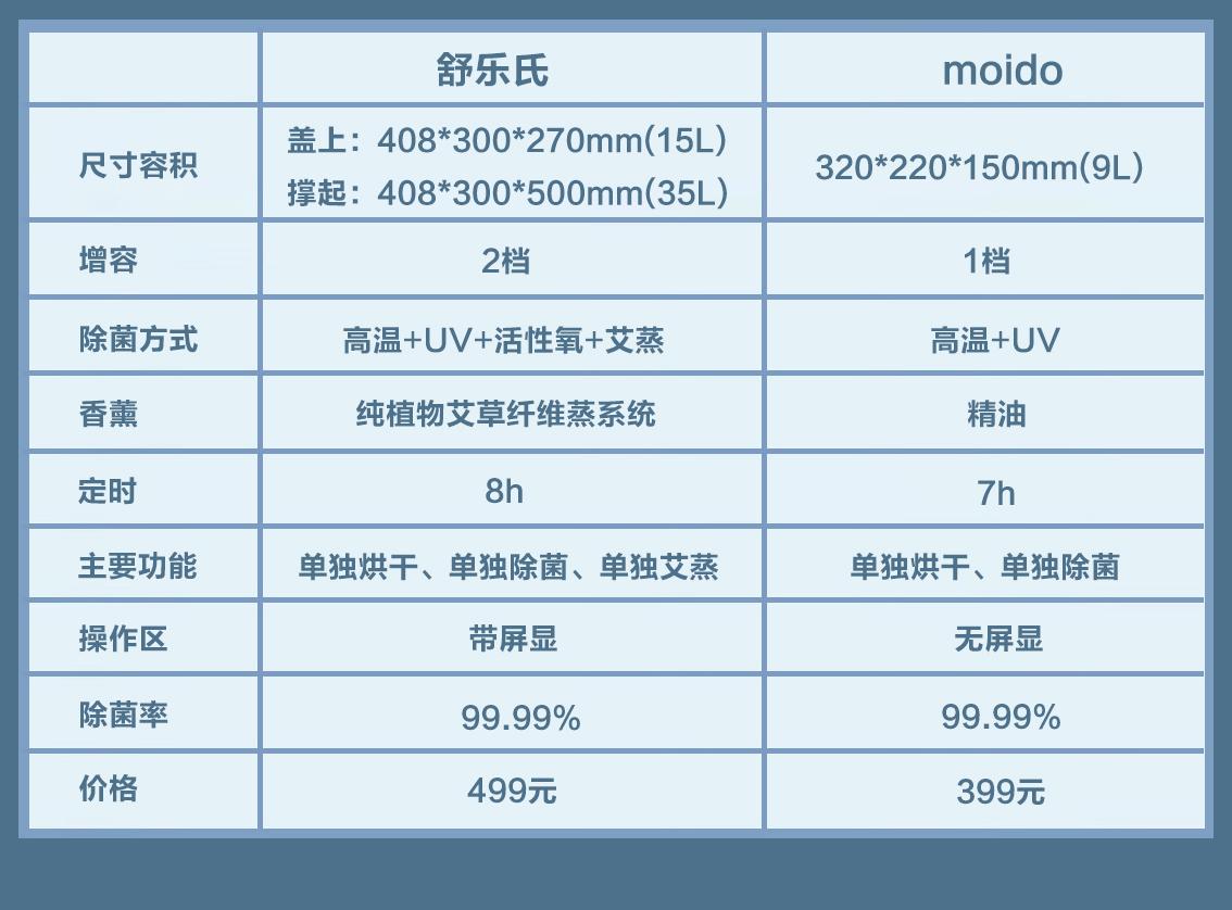 舒乐氏的优点是可以挂晾烘干,有两档折叠大容量,日常实用指数更高。有屏显、可单独操控,杀菌率同样能做到99.99%,且四合一的除菌方式也更彻底,尤其创新加入的艾蒸护理,对女生真的友好。缺点是外观颜色较单一,只有宝石蓝一种颜色可选,临时外出携带女生会觉得有些大。