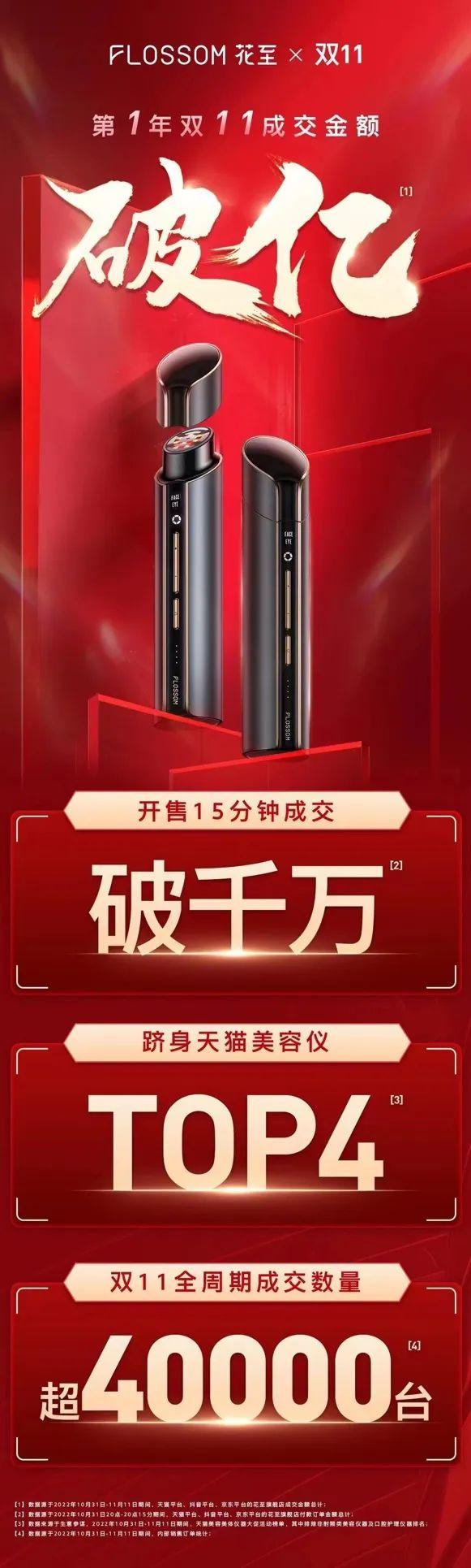 来自天猫公布的双 11 销售数据显示,FLOSSOM花至参加双11成交金额破亿!开售15分钟破千万,双11全周期(10月31日-11月11日)产品成交数量40000台,跻身天猫美容仪TOP 4,天猫快消新品牌双11店铺排行榜TOP 4。